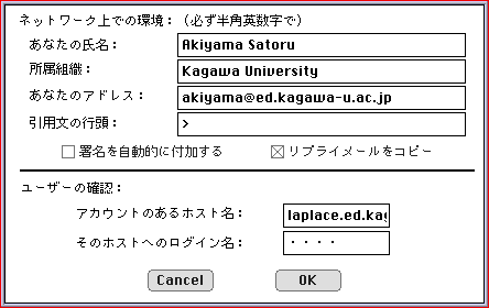 OKすると次のダイアログが現れます.ここではメールの設定をします.ニュースグループではポスト時ほかでメールアドレスが必要になります.